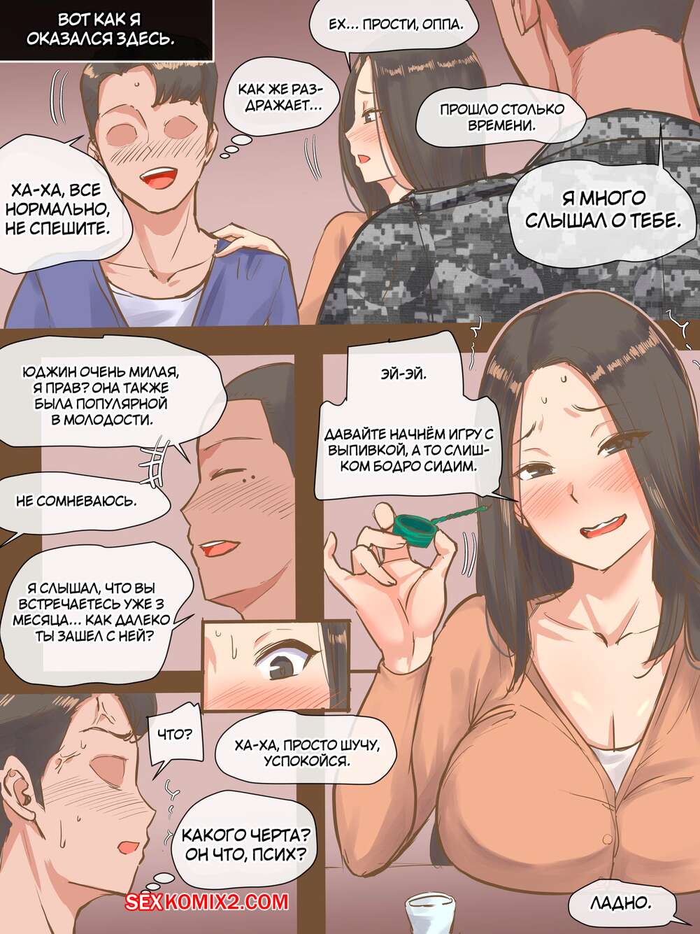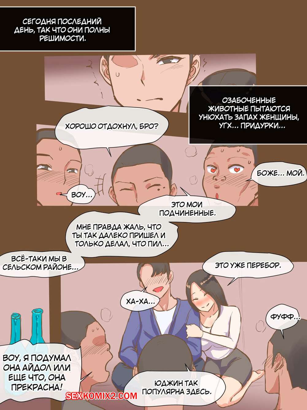 Порно комикс Визит. Visiting Сисястая красотка брюнетка встретилась с друзьями своего парня. Пока ее парень был в отключке, красокта стала сосать большие хуи парней, а затем дала ему выебать себя во все дырочки.